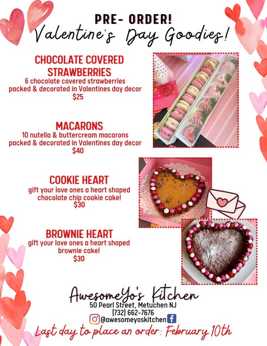 Special Valentine’s Day boxes, chocolate covered strawberries, cakes, macarons and more (place orders by February 10th)!
